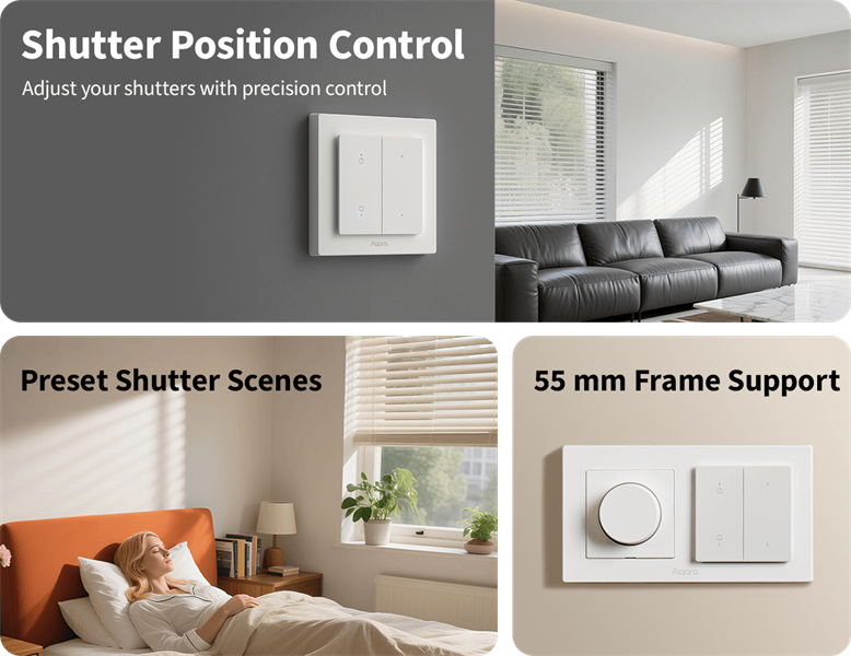 - 2 nút Điều khiển rèm / cửa cuốn (đóng / mở), cài đặt được thời gian hành trình đóng /mở