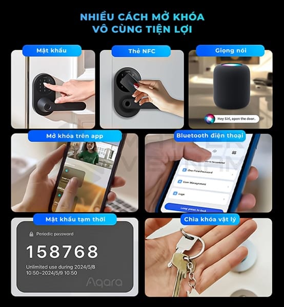 7 cách mở khoá: Aqara Home, Apple Home, HomeKey, NFC, Mật mã, vân tay, mã tạm thời, chìa cơ