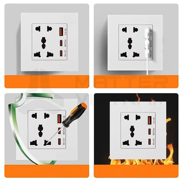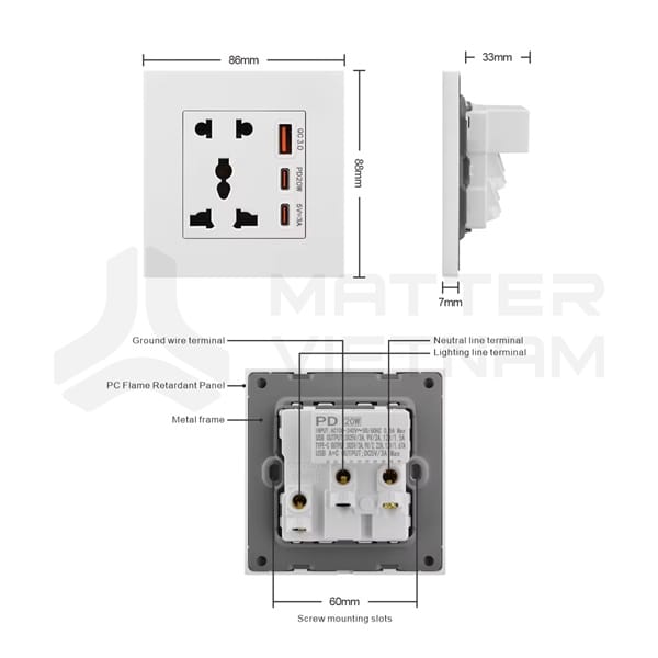 Miêu tả: 2 Ổ cắm đa năng + 1 cổng USB-A + 1 cổng USB Type C